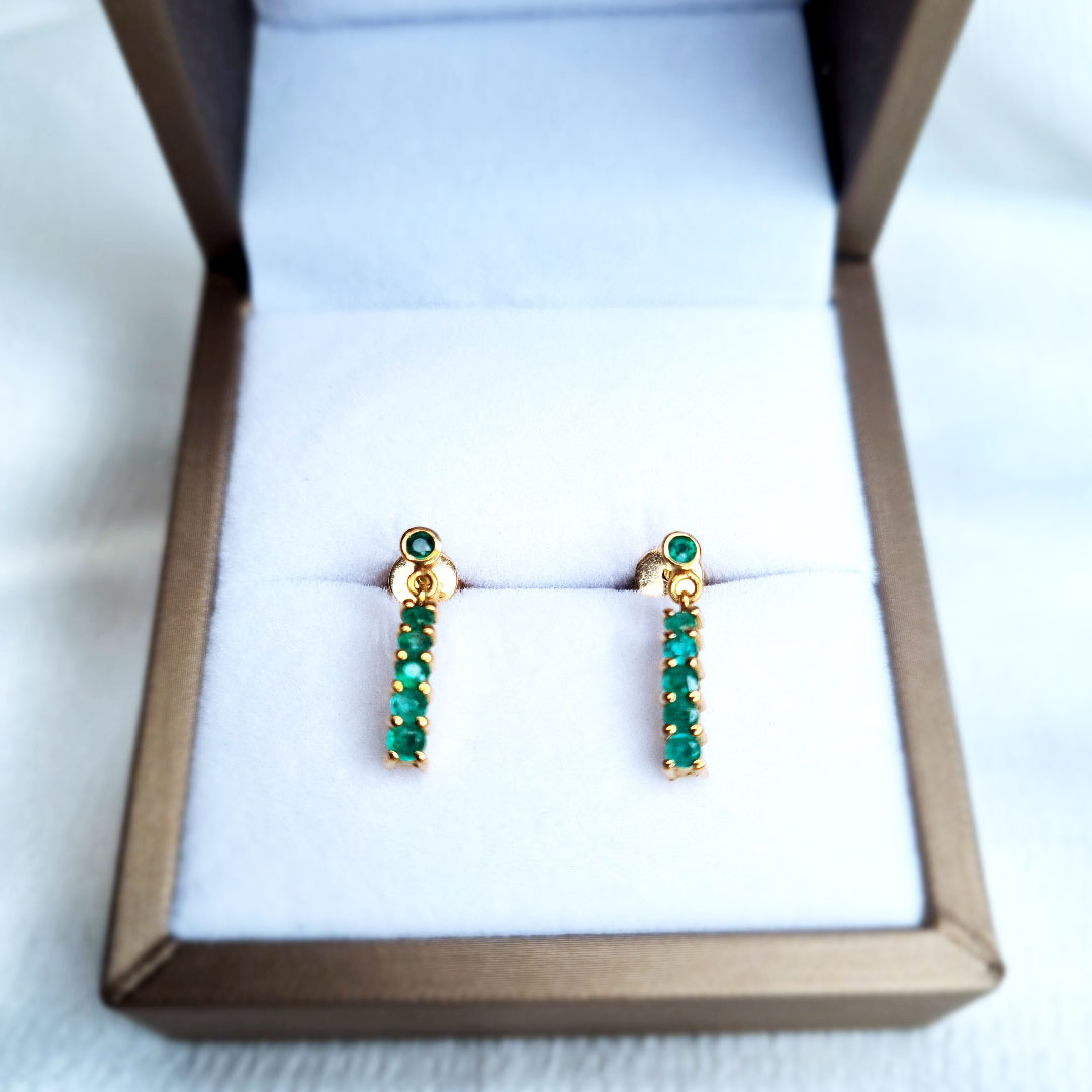 Las piedras, extraídas de las reconocidas minas de Muzo, Colombia, fueron talladas en corte brillante para maximizar su luminosidad, generando destellos naturales con cada movimiento. Este diseño tipo cascada, con estructura ligera, convierte a estos aretes en una opción ideal tanto para el uso cotidiano como para ocasiones especiales que requieren un toque sutil de distinción.