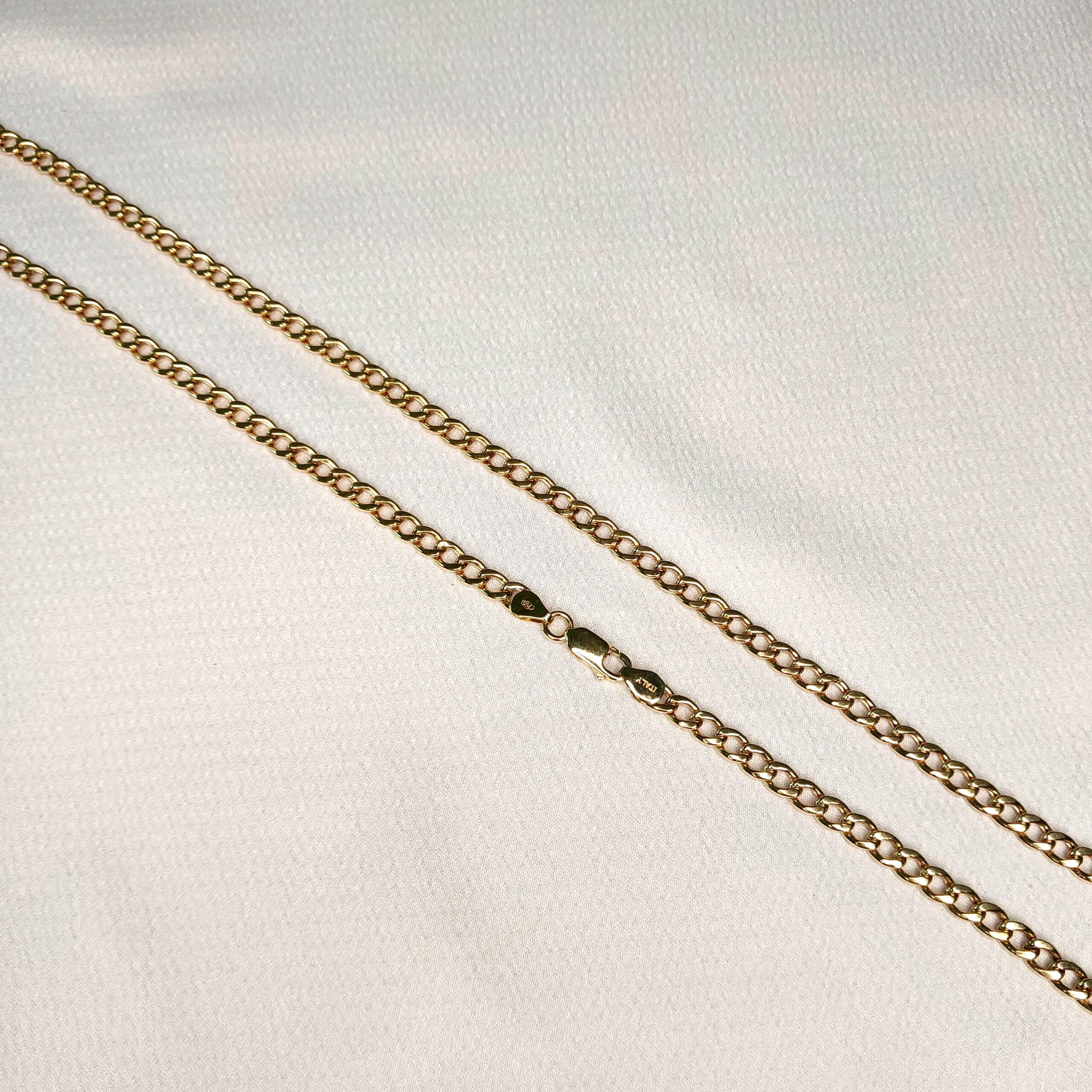 El tejido cubano de esta pieza se distingue por su entrelazado firme, tradicional y robusto. A diferencia de otros estilos más ligeros, esta cadena mantiene una estructura resistente que reposa con elegancia sobre la piel, otorgando una sensación de seguridad y sofisticación. El trenzado ligeramente abierto permite que cada eslabón resalte con luz propia, proyectando un brillo cálido y refinado gracias al oro de alta pureza.
