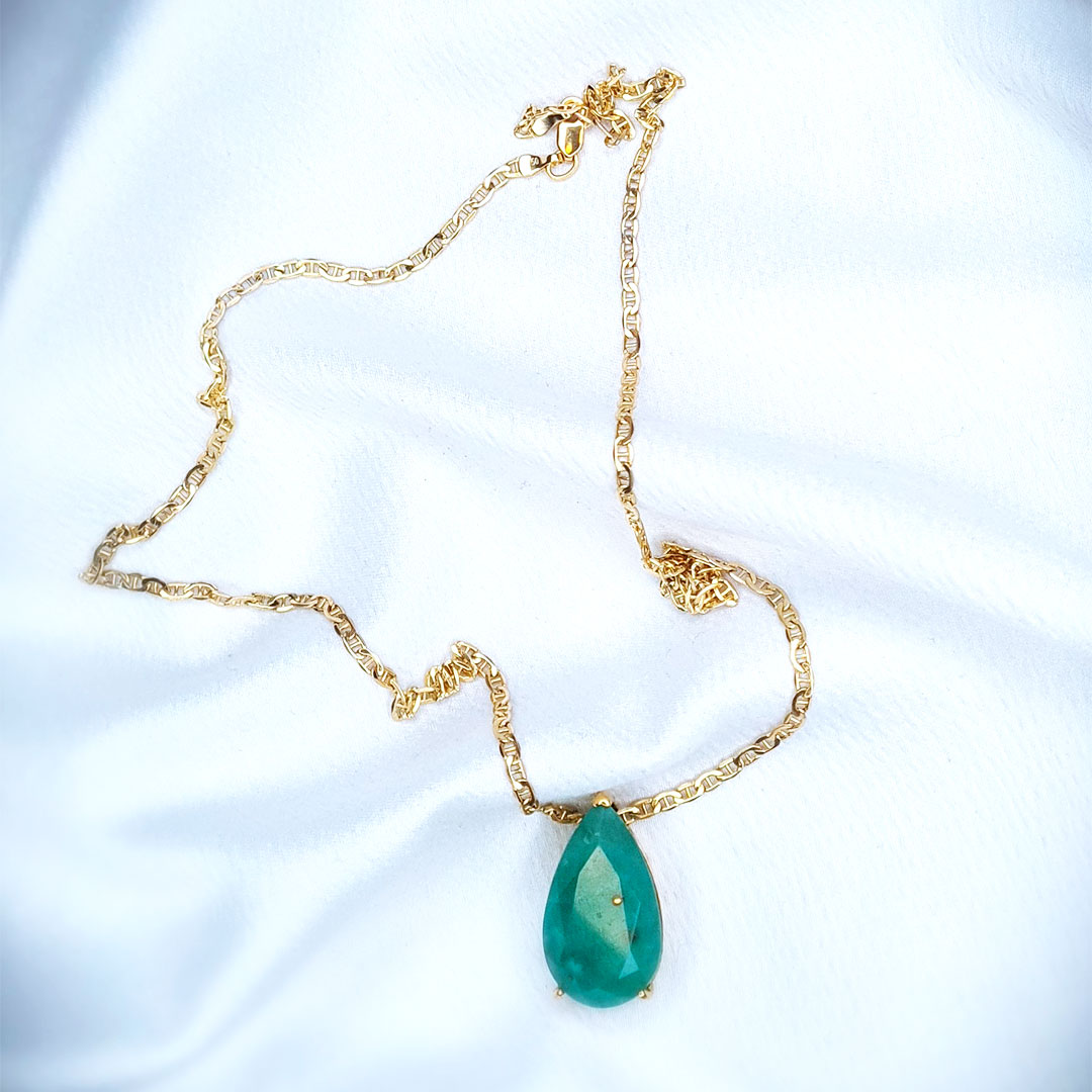 Este collar esmeralda lágrima oro 18K está hecho a mano por orfebres colombianos, cuidando cada detalle del engaste para asegurar equilibrio, seguridad y estética. Su longitud es ideal para lucir sobre la piel o sobre prendas escotadas, captando la atención sin necesidad de exageraciones.