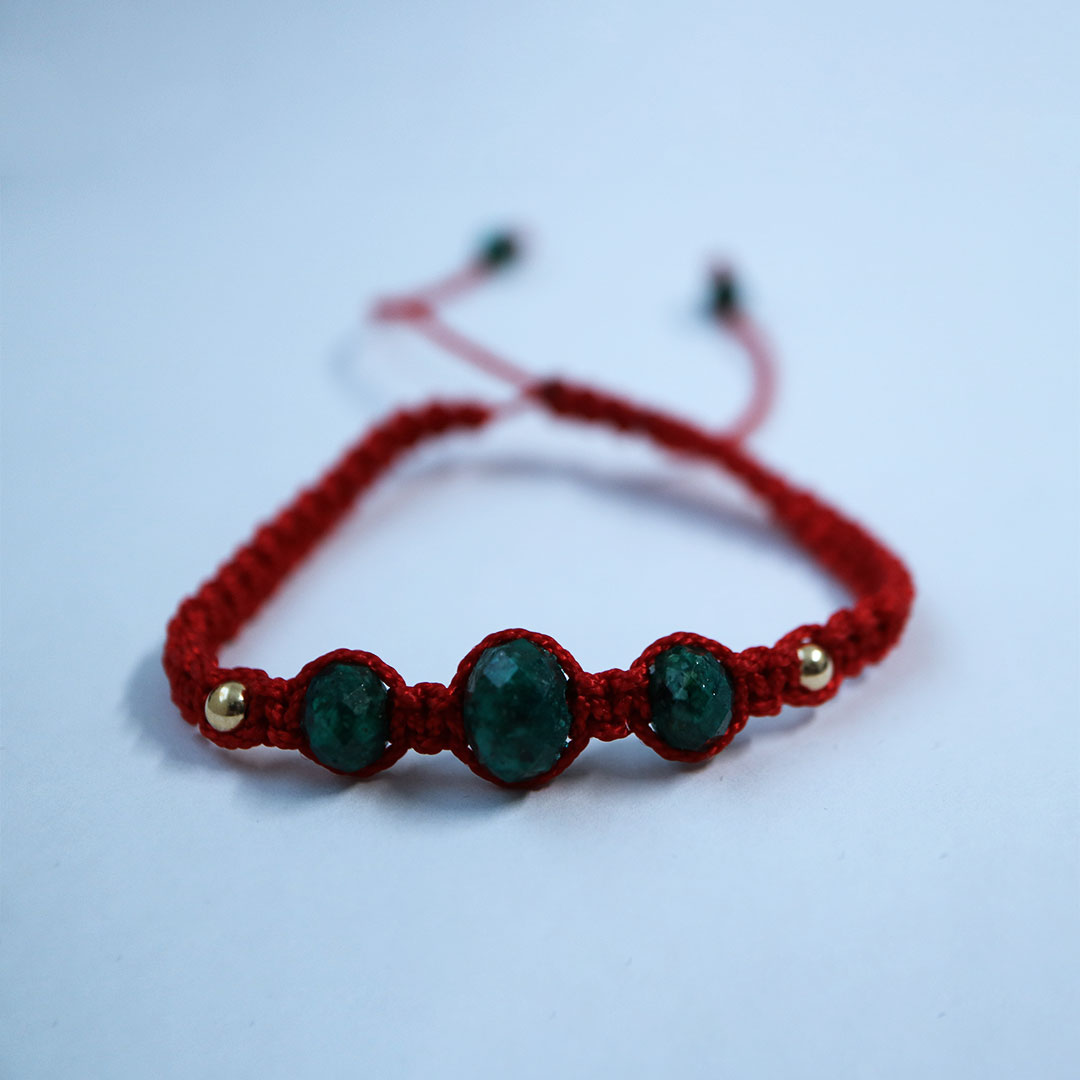 Etiquetas: pulsera esmeralda, hilo rojo, esmeralda cilíndrica, bijouterie artesanal, joya energética, hecha en Colombia, diseño simbólico